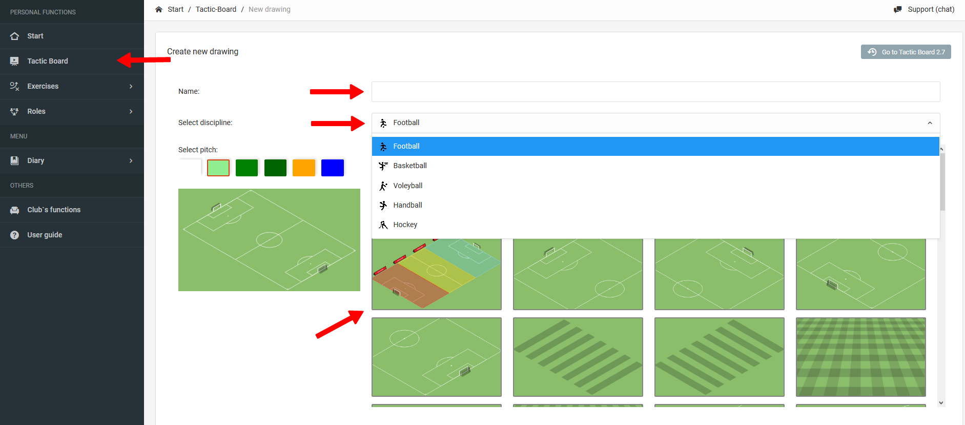 Za izradu novog projekta odaberite "Taktička ploča" s lijevog izbornika. U sljedećem biste trebali navesti parametre novog projekta. To su: ime, uzorak terena i sportska disciplina, koja određuje dostupne poglede na teren.